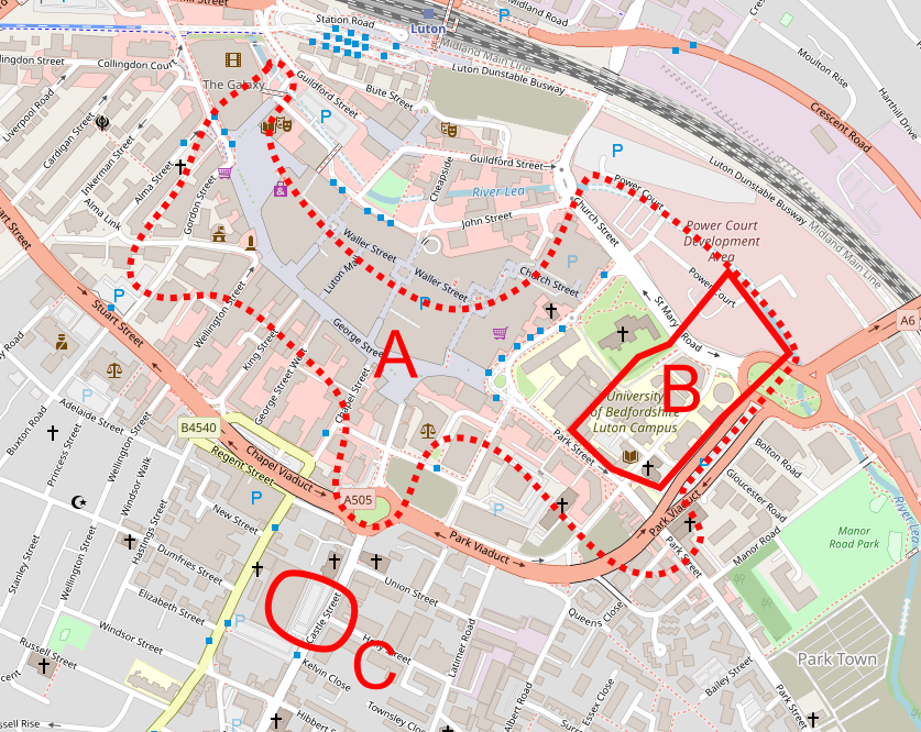 Map of modern Luton, showing position of: A – outline of the medieval settlement; B – outline of Fulk de Breauté’s 13th century castle; C – outline of Robert de Waudari’s 12th century castle.
